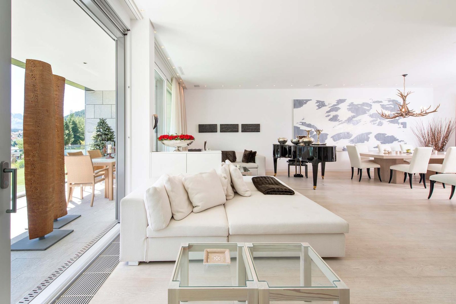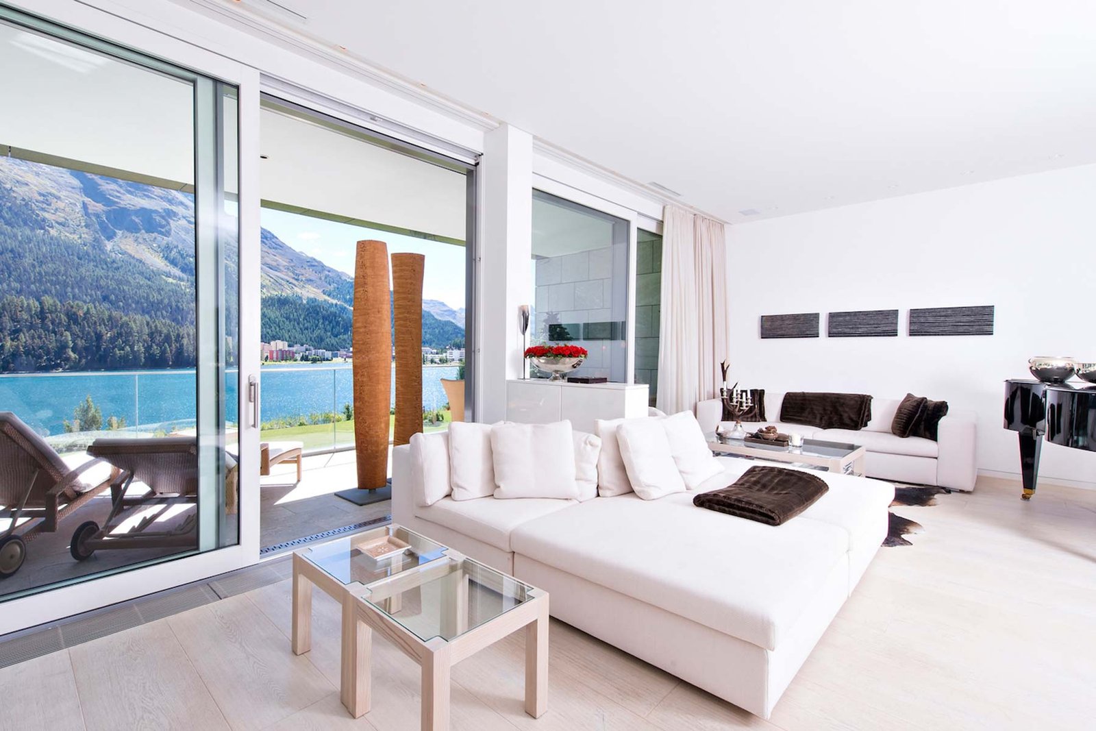 The apartment features a spacious open-plan living and dining area, enhanced by elegant contemporary design, fine materials, and large windows framing spectacular lake and mountain views. Sophisticated interiors include fireplaces, curated art pieces, and even a grand piano, creating a unique alpine atmosphere that blends comfort with exclusivity.